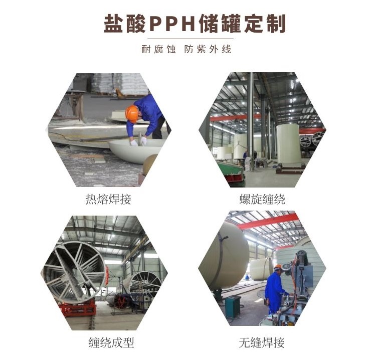 The one-time forming process of hydrochloric acid PPH storage tank adopts spiral extrusion winding technology, and the quality reaches the international advanced level. The main processes include tank winding, external welding, internal seam welding, and nozzle installation.